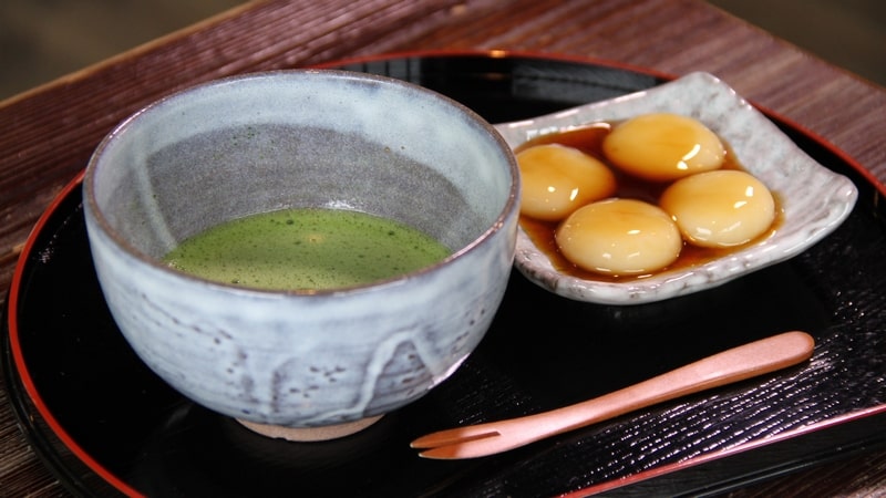 毛越寺本堂を眺めながらいただく抹茶やみたらし団子は、格別の味わいです。